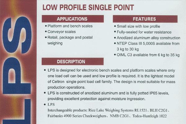 Celtron LPS單點式稱重傳感器專為電子秤和平臺秤設(shè)計,只有一個傳感器的簡單設(shè)計非常適合低平面的稱量,LPS是celtron單點式稱重傳感器中最輕的一款,此設(shè)計多用于大規(guī)模生產(chǎn)經(jīng)營。